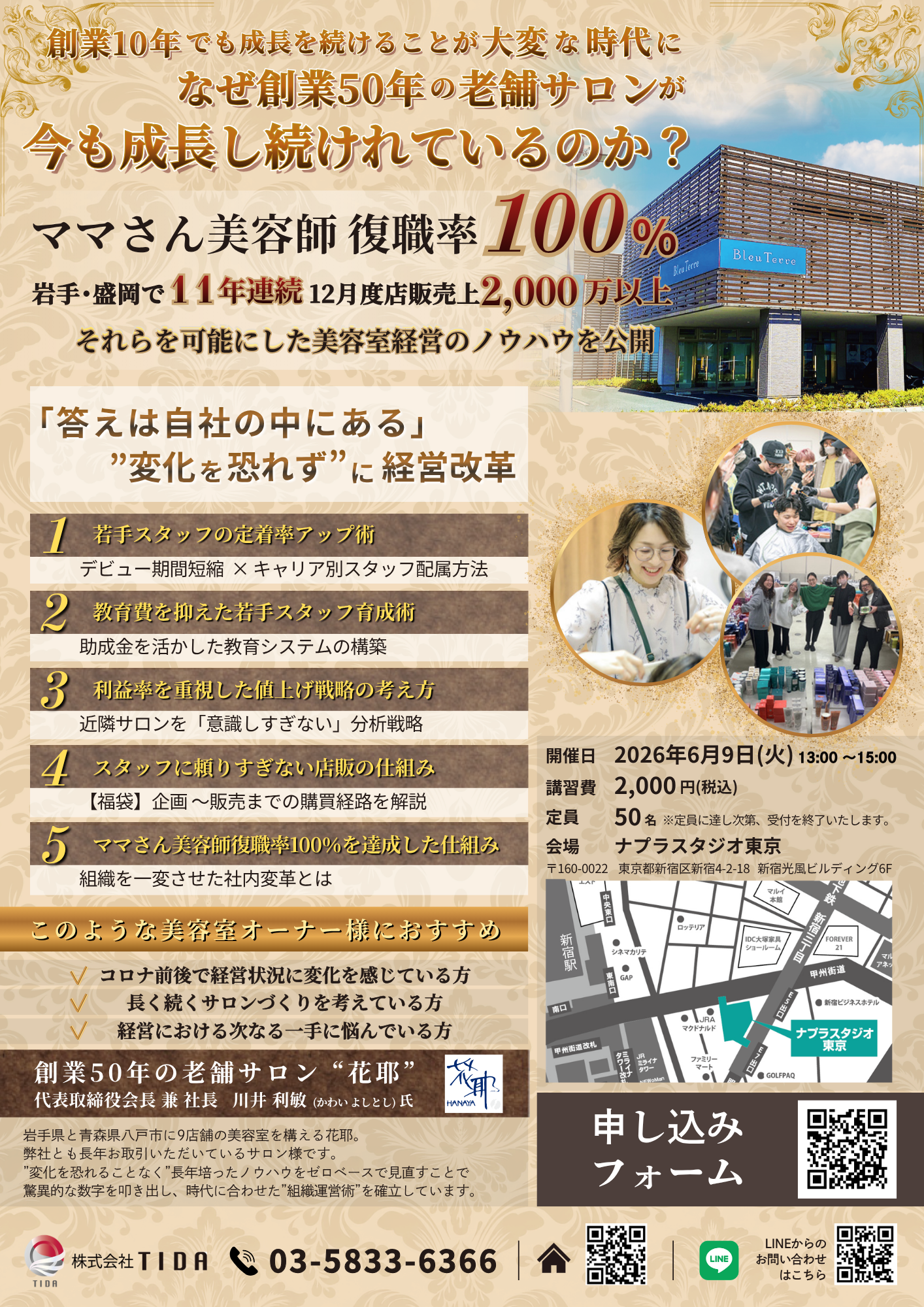 TIDA主催セミナー SPECIAL SEMINAR \ TIDA主催セミナー情報 /東京6月9日(火)|11:00〜13:00~なぜ創業50年の老舗サロンが今も成長し続けているのか?~会場ナプラスタジオ東京東京都新宿区新宿4-2-18 新宿光風ビルディング6F参加費2,000円(税込) ※お支払い方法:口座振替 / クレジットカード定員50名・事前申し込み必須です。・定員に達し次第、受付を終了させていただきます。 GUEST SPEAKER 創業50年の老舗サロン‘‘花耶’’代表取締役会長 兼 社長 川井 利敏 氏 岩手県と青森県八戸市に9店舗の美容室を構える「花耶」。 サロンHPはこちら ‘‘変化を恐れることなく’’長年培ったノウハウをゼロベースで見直すことで驚異的な数字を叩き出し、時代に合わせた‘‘組織運営術’’を確立しています。 お申込みはこちら→ 会員のみ閲覧可能なページがございます。 会員登録後に様々なお役立ち情報がご覧いただけます。 会員登録・ログインはこちら